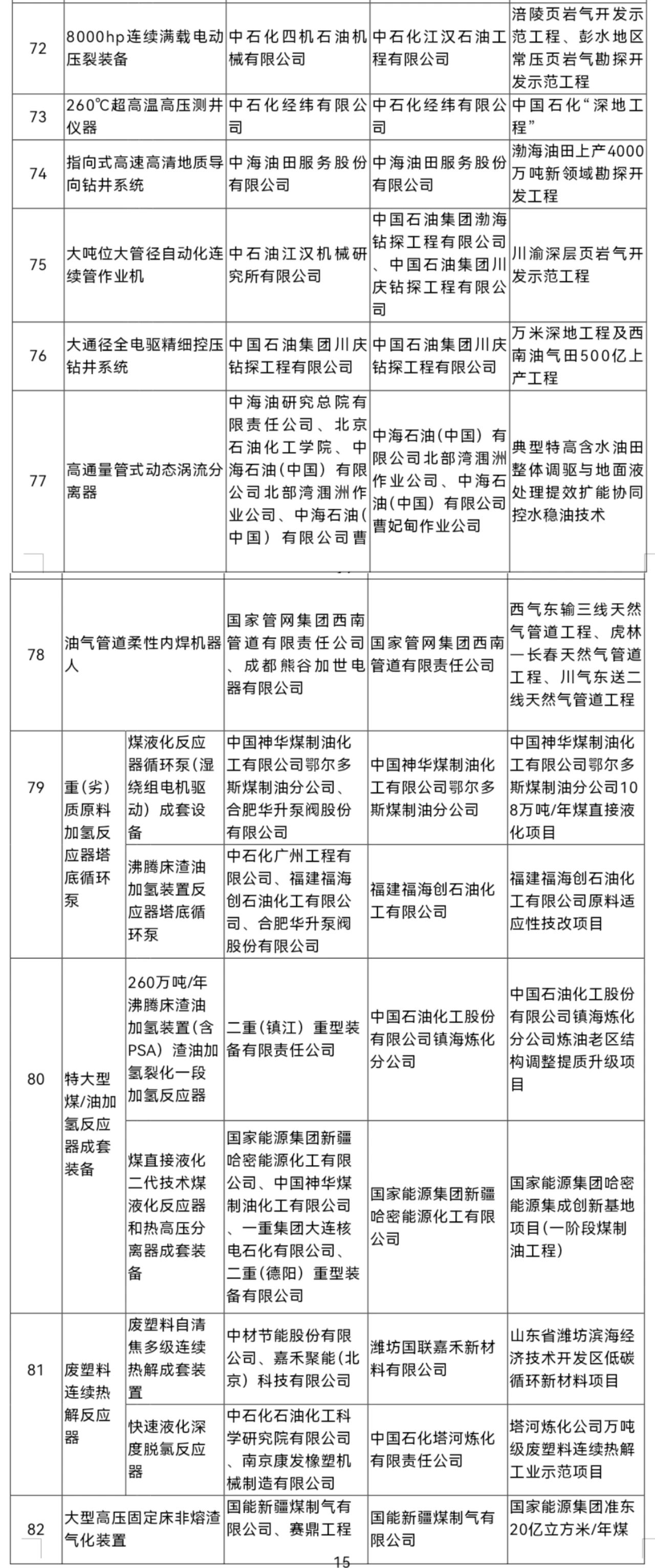 其中,在能源化工領域,中石化、中石油、中海油、國家能源集團等企業(yè)的多臺套技術(shù)裝備入圍名單。具體見下表: