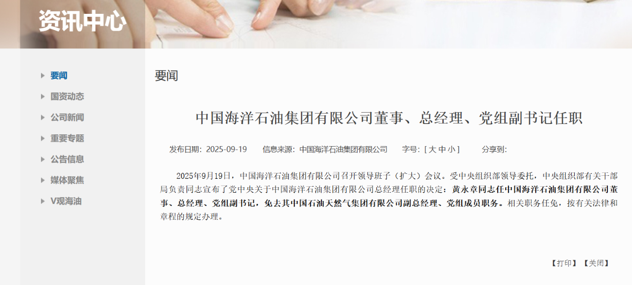 9月19日,中國海洋石油集團有限公司(以下簡稱“中海油集團”)官網(wǎng)發(fā)布消息稱,在當日集團舉行的領(lǐng)導(dǎo)班子(擴大)會議上,黃永章被任命為任集團董事、總經(jīng)理、黨組副書記,同時免去其中國石油天然氣集團有限公司(以下簡稱“中石油集團”)副總經(jīng)理、黨組成員職務(wù)。