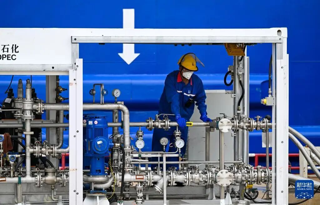 9月22日,在天津港環(huán)球滾裝碼頭,工作人員在加注前檢查設(shè)備。新華社記者 趙子碩 攝