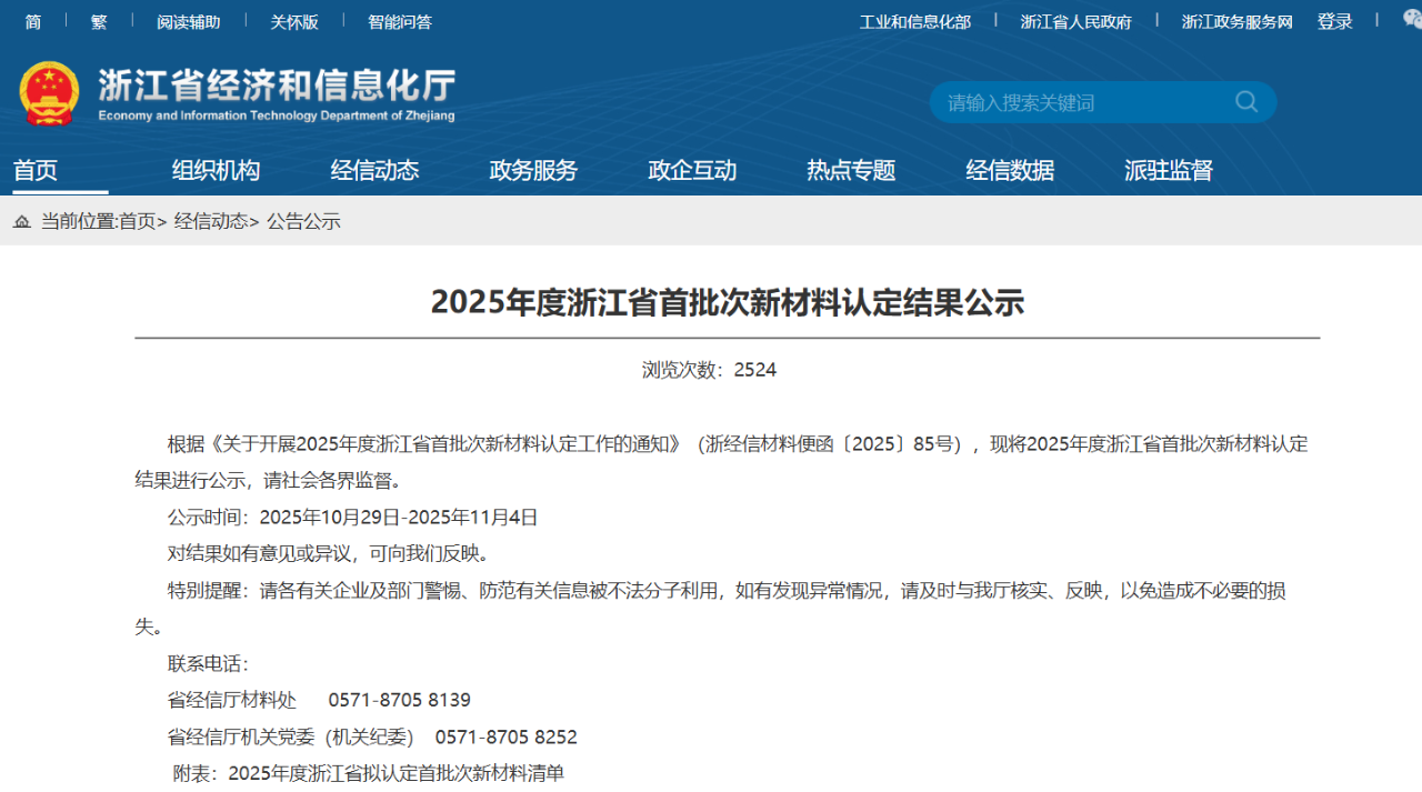 根據《關于開展2025年度浙江省首批次新材料認定工作的通知》(浙經信材料便函〔2025〕85號),現將2025年度浙江省首批次新材料認定結果進行公示,請社會各界監(jiān)督。