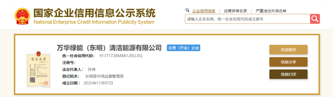 國家企業(yè)信用信息公示系統(tǒng)顯示,11月7日,萬華綠能(東明)清潔能源有限公司成立,注冊資本7.2億元,法定代表人孫偉。