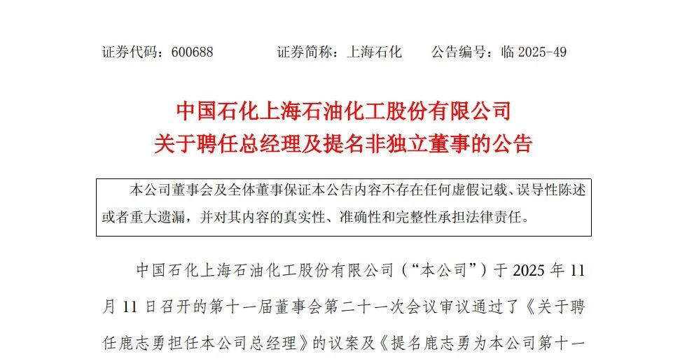 中國(guó)石化上海石油化工股份有限公司(下稱(chēng)“本公司”)于2025年11月11日召開(kāi)的第十一屆董事會(huì)第二十一次會(huì)議審議通過(guò)了《關(guān)于聘任鹿志勇?lián)伪竟究偨?jīng)理》的議案及《提名鹿志勇為本公司第十一屆董事會(huì)非獨(dú)立董事候選人》的議案。