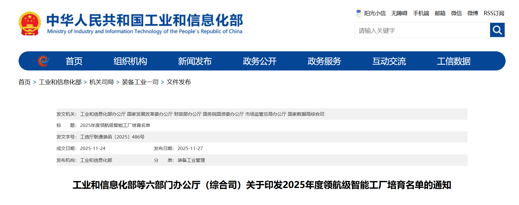 工業(yè)和信息化部等六部門辦公廳(綜合司)關(guān)于印發(fā)2025年度領(lǐng)航級智能工廠培育名單的通知