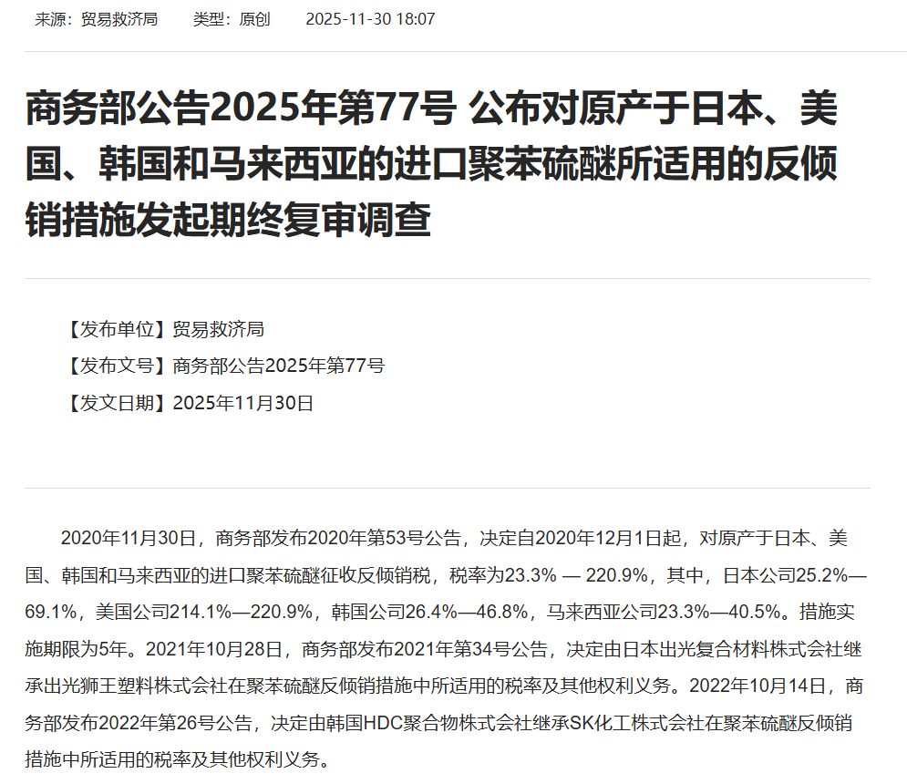 商務(wù)部宣布自2025年12月1日起,對原產(chǎn)于日本、美國、韓國和馬來西亞的進口聚苯硫醚(PPS)所適用的反傾銷措施進行期終復(fù)審調(diào)查。在為期一年的復(fù)審期間,將繼續(xù)實施反傾銷措施。
