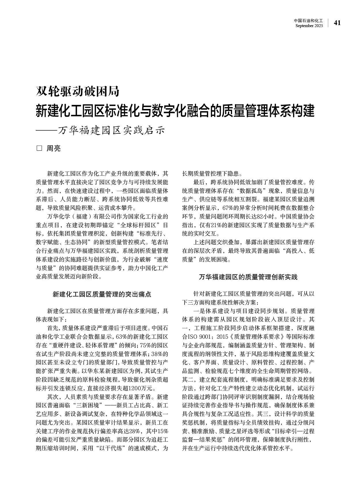 雙輪驅動破困局新建化工園區(qū)標準化與數(shù)字化融合的質量管理體系構建——萬華福建園區(qū)實踐啟示