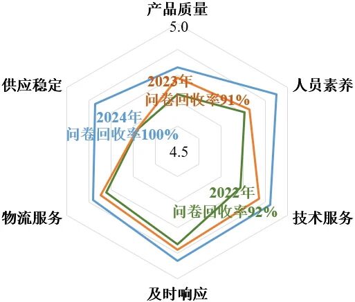 通過構建全鏈條質量管理體系,萬華福建園區(qū)在客戶滿意度方面實現(xiàn)顯著突破(如圖1)。產(chǎn)品質量維度從4.72分提升至4.83分,人員素養(yǎng)、技術服務與及時響應均突破4.90分高位。值得注意的是,2024年問卷回收率達100%,反映出客戶參與意愿的增強。多維指標的系統(tǒng)性提升印證了“質量前移”策略的有效性。