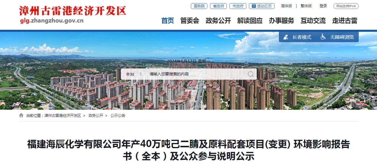 6月14日,漳州古雷開發(fā)區(qū)管委會(huì)發(fā)布公告,對(duì)福建海辰化學(xué)有限公司年產(chǎn)40萬(wàn)噸己二腈及原料配套項(xiàng)目(變更) 環(huán)境影響報(bào)告書(全本)及公眾參與說(shuō)明進(jìn)行公示。
