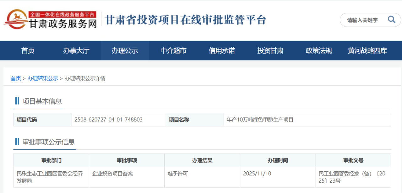 甘肅省年產(chǎn)10萬(wàn)噸綠色甲醇生產(chǎn)項(xiàng)目備案準(zhǔn)予許可